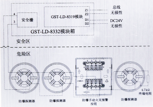 GST-LD-8332編址接口模塊(以下簡(jiǎn)稱編址接口模塊)可與防爆設(shè)備(防爆感溫、感煙、煙溫復(fù)合探測(cè)器、防爆手動(dòng)報(bào)警按鈕等)配接,組成本安型防爆系統(tǒng)。一旦發(fā)生火災(zāi),編址接口模塊將報(bào)警信號(hào)通過總線傳入火災(zāi)報(bào)警控制器(以下簡(jiǎn)稱控制器),控制器產(chǎn)生報(bào)警信號(hào)并顯示出編址接口模塊的報(bào)警地址信息。當(dāng)編址接口模塊本身出現(xiàn)故障時(shí),控制器將產(chǎn)生故障信號(hào)并顯示編址接口模塊故障地址信息。