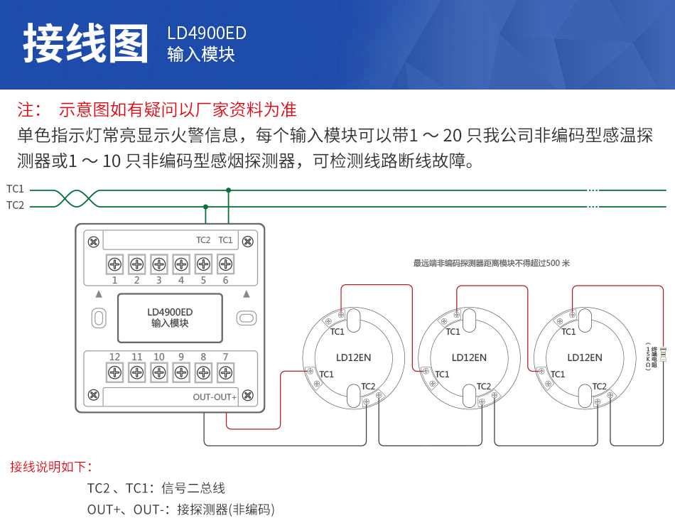 1、LD4900ED輸入模塊為二總線(xiàn),無(wú)極性。 2、采用電子編碼,占一個(gè)節(jié)點(diǎn)地址(0~255)。 3、單色指示燈常亮顯示火警信息。 4、每個(gè)LD4900ED輸入模塊可以帶1~20只利達(dá)公司非編碼型探測(cè)器。 5、LD4900ED輸入模塊可檢測(cè)線(xiàn)路斷線(xiàn)故障。