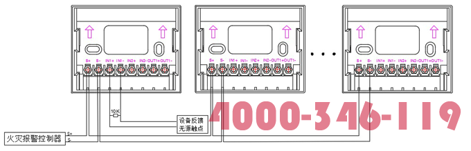 “S+”、”S-”為總線端子,接入火災(zāi)報(bào)警控制器;“IN1+”、“IN1-”接現(xiàn)場設(shè)備無源觸點(diǎn)的常開或常閉開關(guān)量信號(hào),同時(shí)在被控設(shè)備的常開觸點(diǎn)上直接并接一個(gè)10K終端電阻。