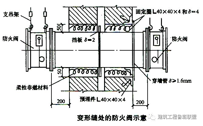 ①②:風(fēng)管穿越變形縫一端(左)設(shè)置活動(dòng)吊架,另外一端(右)設(shè)置風(fēng)管固定吊架。